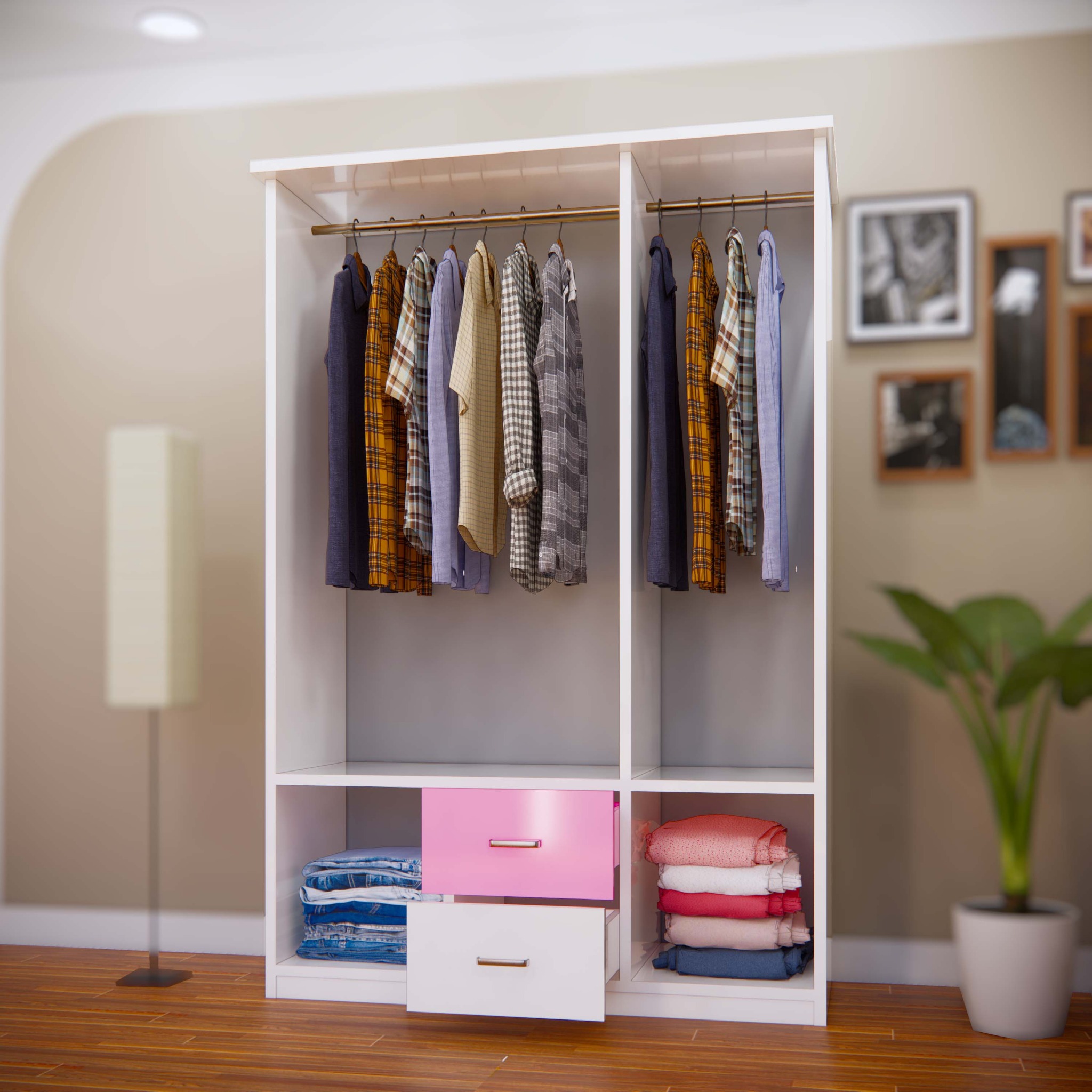Với không gian gồm 2 buồng treo, 2 ngăn kéo và khoang để gấp đồ bạn sẽ yên tâm với không gian đầy đủ để sắp xếp quần áo của mình.