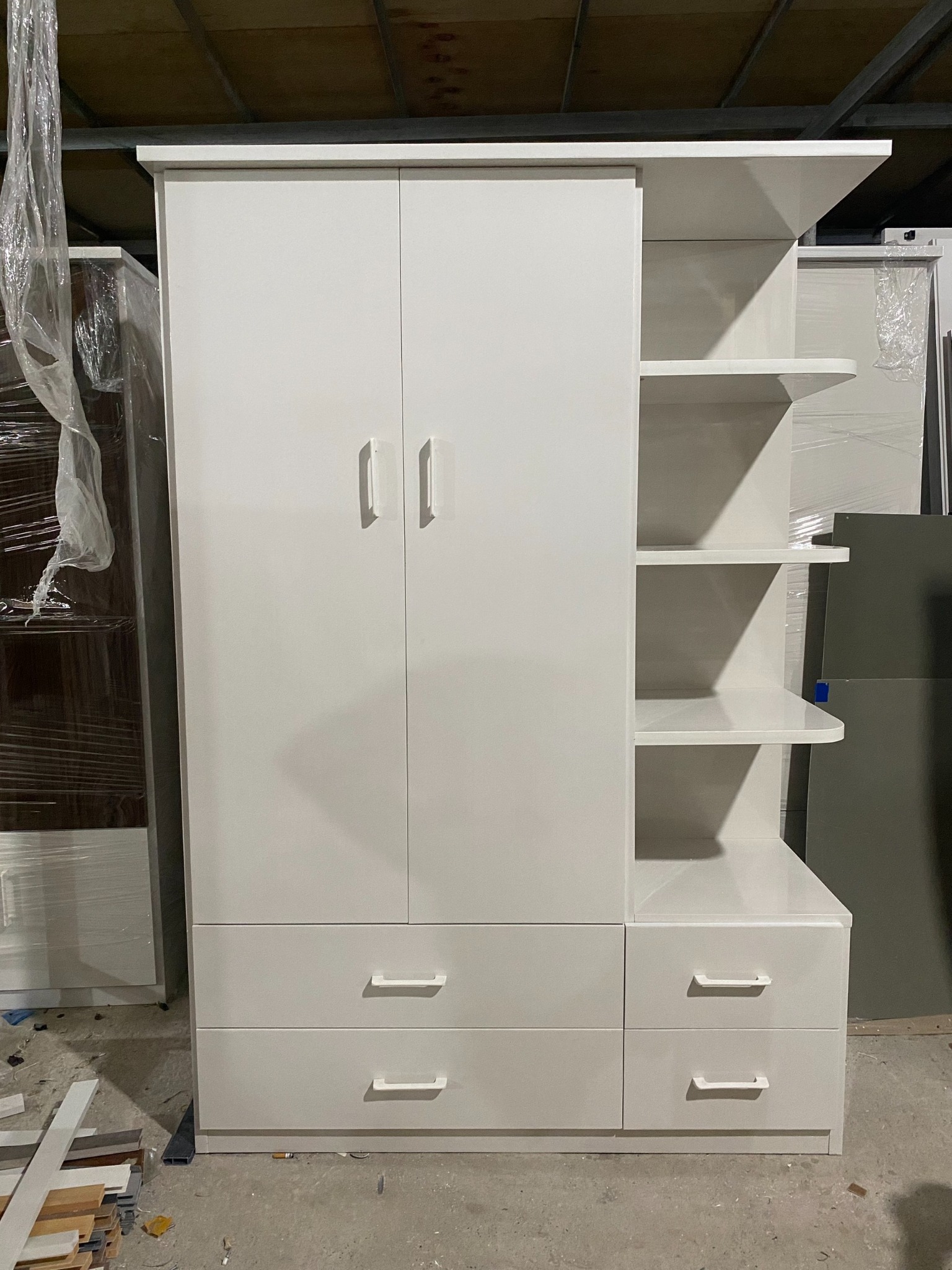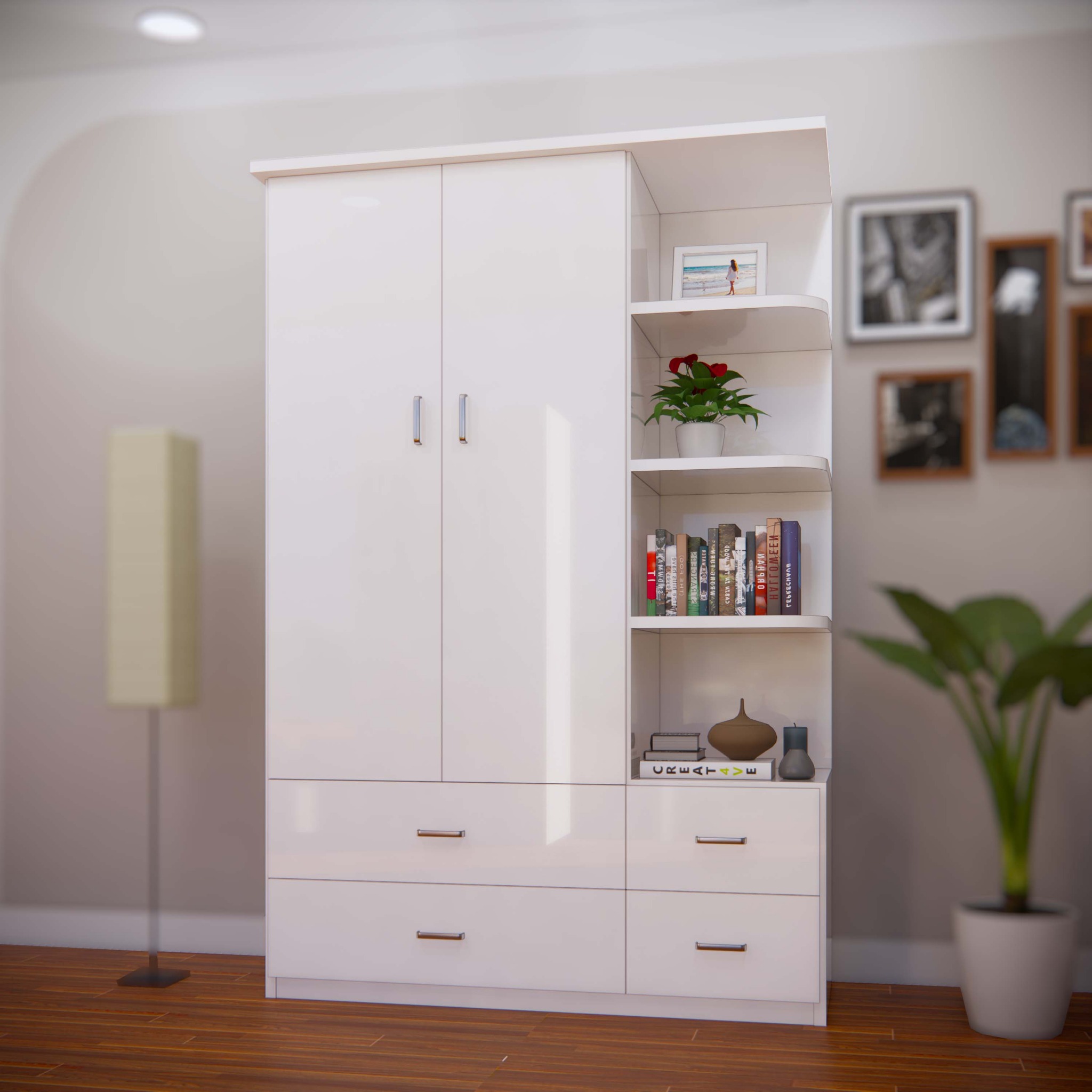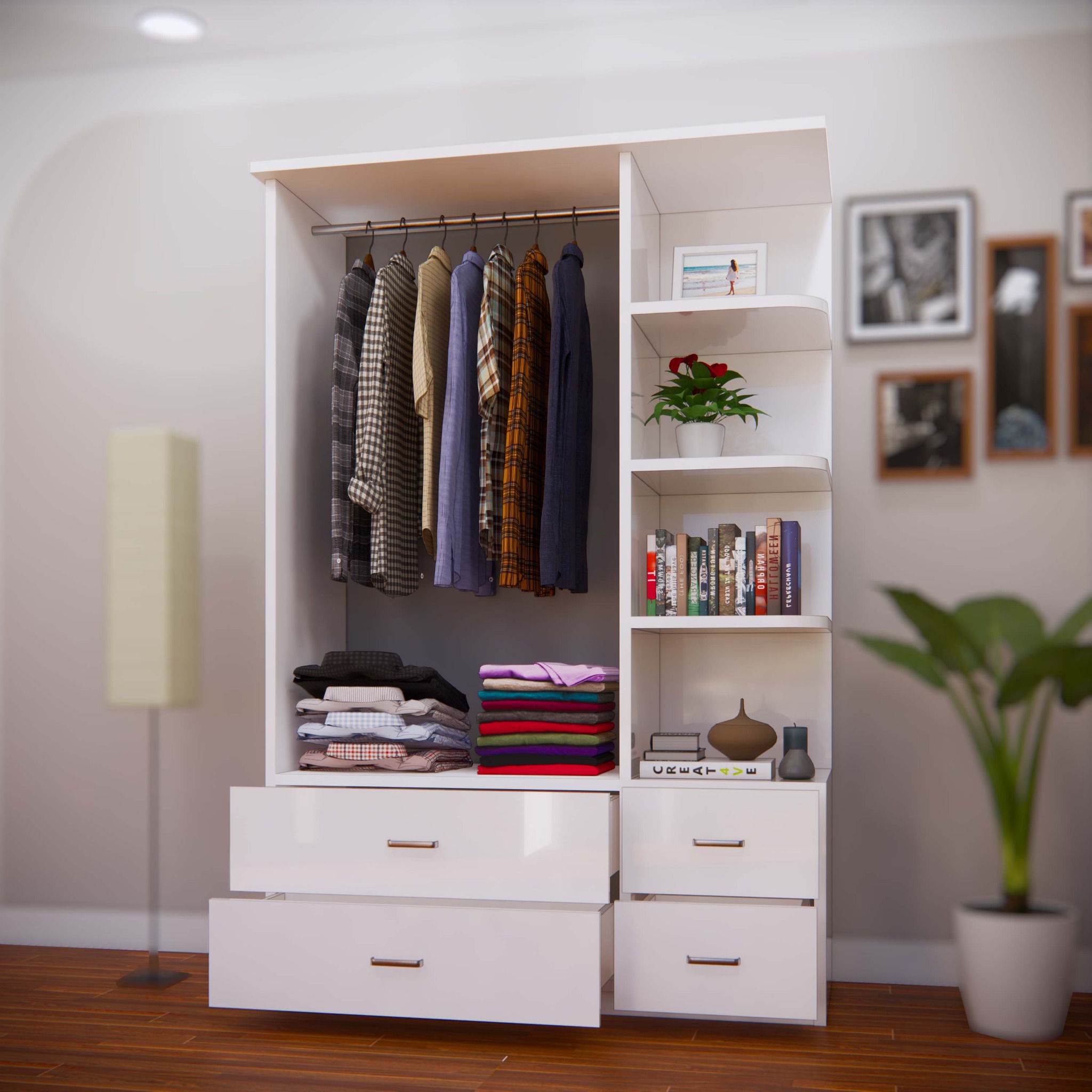 Với không gian gồm 1 buồng treo, 4 ngăn kéo và 1 kệ trang trí để đồ bạn sẽ yên tâm với không gian đầy đủ để sắp xếp quần áo của mình.
